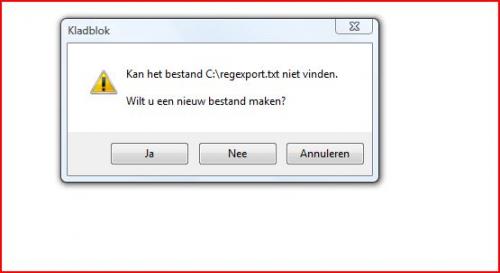 Hallo, Hierbij de originele foutmelding, en de foutmelding die ik krijg als ik het .bat bestand probeer te openen. Groetjes Patricia - - - Updated - - - Als admin uitvoeren heeft toch een nader resultaat;): Windows Registry Editor Version 5.00 [HKEY_LOCAL_MACHINE\software\microsoft\windows nt\currentversion\windows] "AppInit_DLLs"="" "LoadAppInit_DLLs"=dword:00000001 "IconServiceLib"="IconCodecService.dll" "DdeSendTimeout"=dword:00000000 "DesktopHeapLogging"=dword:00000001 "GDIProcessHandleQuota"=dword:00002710 "ShutdownWarningDialogTimeout"=dword:ffffffff "USERPostMessageLimit"=dword:00002710 "USERProcessHandleQuota"=dword:00002710 @="mnmsrvc" "DeviceNotSelectedTimeout"="15" "Spooler"="yes" "TransmissionRetryTimeout"="90" "USERNestedWindowLimit"=dword:00000032