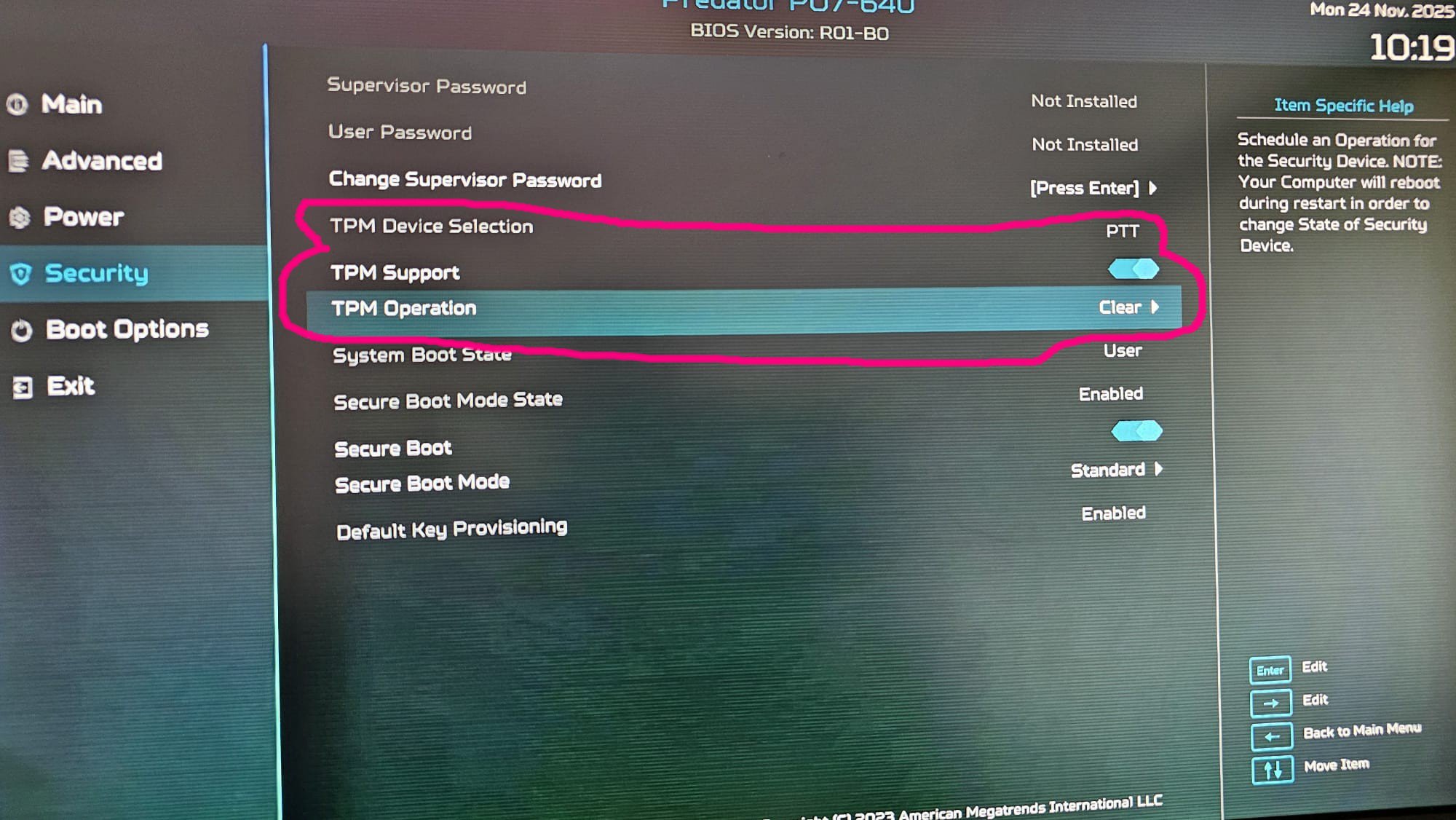 Beste Ik zou graag de nieuwe windows instaleren maar zegt telkens dat TPM 0.2 niet aanwezig is op mijne pc Ik heb in de bios gekeken en daar staat hij aan PC is maar 2 jaar oud 12th Gen Intel(R) Core(TM) i9-12900K (3.20 GHz) Acer Predator Benny