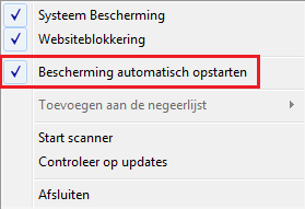 In de systeembalk zou je normaal het rood omlijnde icoontje van Malware Bytes moeten terug vinden. Rechtsklik op dit icoon waarna onderstaand menu verschijnt. Haal het vinkje bij "Bescherming automatisch opstarten" weg en herstart je systeem. Heeft dit een positieve invloed op je systeem prestaties?
