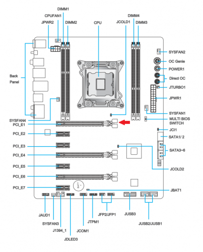 Normaal gezien hoor je de grafische kaart in PCIe slot 1 te steken. Klik op de afbeelding om in te zoomen!! De andere slots zijn er als je gebruik wilt maken van SLI of Crossfire.