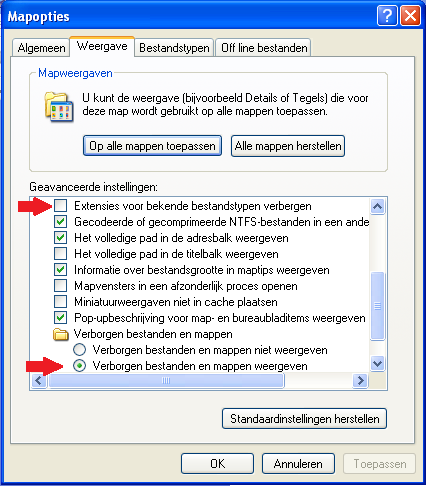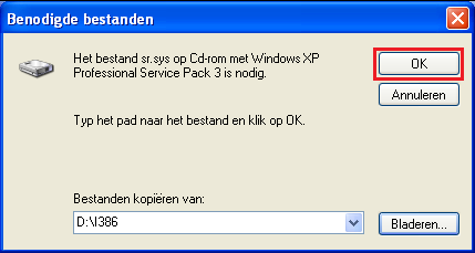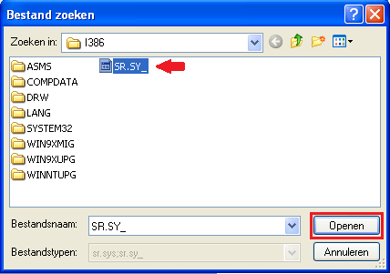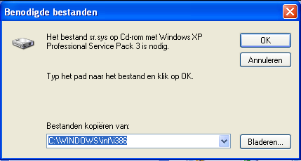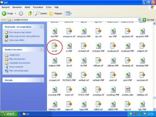 Dan gaan we een poging wagen om systeem-restore (systeemherstel) te herinstalleren. Leg de Windows XP installatie cd in je cd/dvd-rom station. Ga naar Mapopties Haal het vinkje weg bij Extensies voor bekende bestandstypen verbergen. Vink Verborgen bestanden en mappen weergeven aan. Klik op Toepassen en bevestig met OK Navigeer naar de volgende map >> C:\WINDOWS\inf Klik op de afbeelding om ze te vergroten en in deze map zoek je naar het bestand sr.inf Rechtsklik op sr.inf en kies voor Installeren waarna volgende venster wordt getoond. Klik op Bladeren en we gaan naar het volgende venster Selecteer SR.SY en klik op Openen Klik op OK en de benodigde bestanden worden naar je systeemschijf gekopieerd waarna de volgende melding verschijnt. Klik hier op Ja om je computer opnieuw op te starten. Hoe zit het na het opnieuw opstarten met systeemherstel?