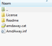 Download eens het volgende bestand >> AMDAWAY.rar Pak het bestand uit, in de uitgepakte map vind je een setup bestand en een andere ingepakt bestand met naam AmdAway. Pak ook dit ingepakt bestand uit en je ziet in deze uitgepakte map de volgende bestanden staan Laat nu eens in deze map zoeken naar een driver zoals ik vermeld hebt in bericht #17
