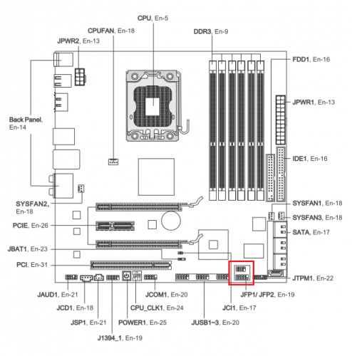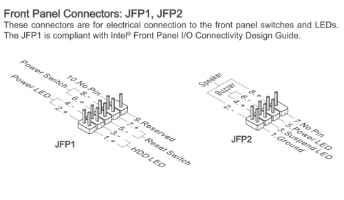 Dan zal je jou pc kast moeten openen om de aansluitingen op het moederbord te controleren. Waar ik in de afbeelding de rode markering heb aangebracht zitten de diverse aansluitingen voor je start, reset, HD led en power led. Kijk eens of de stekkertjes nog goed op hun plaats zitten Uit vergroot ziet de aansluiting er zo uit, op de stekkertjes vind je aanwijzingen terug die je ook in de bovenstaande afbeelding terug vind.