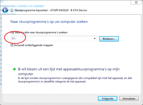 Dat brengt ons dus ook niet dichter bij een mogelijke oplossing In het onderstaande scherm Met de knop bladeren navigeer je naar je C schijf en selecteer deze en klik op OK. Klik dan op volgende en laat eens op deze C schijf naar een driver zoeken.