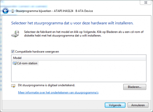 3. Er zijn geen schendingen van de integriteit gevonden dat is alvast goed nieuws. In apparaatbeheer klik je rechts op het onbekende apparaat en kies Stuurprogramma's bijwerken, in het volgende venster wat opent kies je Op mijn computer naar stuurprogramma's zoeken In het venster wat dan verschijnt kies je Ik wil kiezen uit een lijst met apparaatstuurprogramma's op mijn computer Waarna je iets in de volgende trend zult zien Waar bij mij "Cd-rom-station" staat word daar bij jou een driver vermeld?