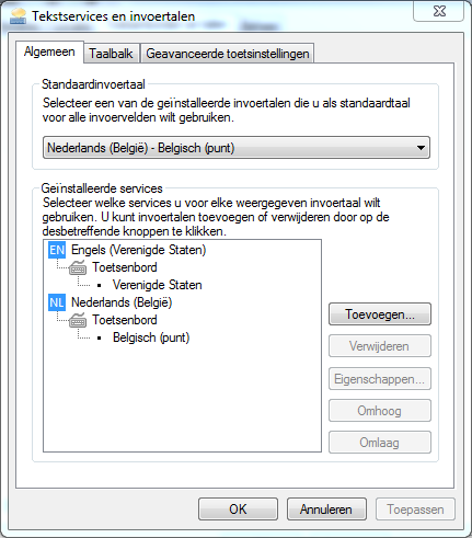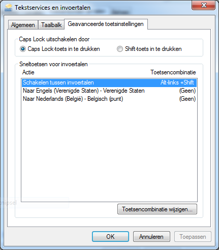 5. Ga eens via Start/Configuratiescherm en klik op Land en taal. Vervolgens ga je naar het tabblad Toetsenborden en talen en in het scherm klik je op Toetsenborden wijzigen waarna volgende venster verschijnt. Kun je hier eens een screenshot van maken en plaatsen in je volgende bericht. Als ik het goed heb zou hier Nederlands - Verenigde Staten (Internationaal) horen te staan. Ga nu naar het tabblad Geavanceerde toetsinstellingen Hier kun je zien of er een toetsencombinatie is toegewezen. Selecteer de toetsencombinatie en klik op Toetsencombinatie wijzigen. In het venster wat je nu te zien krijgt vind je verschillende opties van de door jou geselecteerde toetsencombinatie. Met de opties Niet toegewezen schakel je deze uit. Lost dit je probleem op?