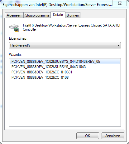 Ga via Start naar Uitvoeren en typ in het uitvoervenster devmgmt.msc en druk op Enter waarna je terug in apparaatbeheer komt. Navigeer naar Systeemaparaten en klik op het + teken Je ziet daar PCI standaard host CPU bridge staan. Rechtsklik hierop en kies Eigenschappen waarna een venster opent. Ga nu naar het tabblad Details Onder Eigenschap: kies je Hardware-id's Geef eens de eerste regel onder Waarde: Misschien dat we zo verder komen.