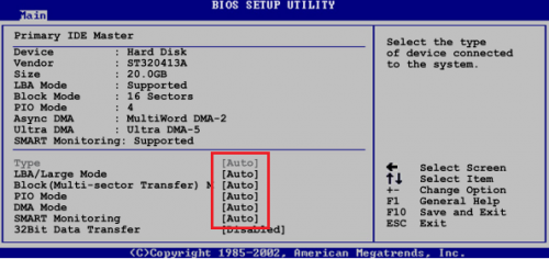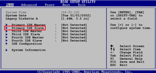 Tijdens het opstarten van je pc druk je herhaaldelijk op de Del toets om in je BIOS te komen. Met de pijltjes toetsen navigeer je door je BIOS, met de Enter toets kun je een item selecteren en met de + & - toetsen kun je een waarde wijzigen. Eén maal in je BIOS krijg je het volgende scherm. Navigeer naar Primary IDE Slave en druk op de Enter toets, controleer eveneens of de schijf niet elders word weergegeven. Kijk dan eens of de omlijnde opties op AUTO staan. Dan heb ik nog een vraag voor je, gebruik je een 40 aderige IDE kabel of een 80 aderige IDE kabel??