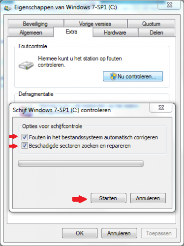 14. Dan vermoed ik een probleem met je harde schijf, helaas. Je kan nog een Windows schijfcontrole uitvoeren. Ga via Start naar Computer en rechtsklik op je C-schijf en kies Eigenschappen en ga naar het tabblad Extra en klik op Nu controleren Vink beide opties aan en klik op Starten Je zal een melding krijgen dat de schijfcontrole word uitgevoerd bij de volgende start, herstart dan je netbook en onderbreek de schijfcontrole niet. Wat is hier het resultaat van?