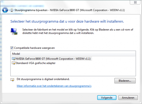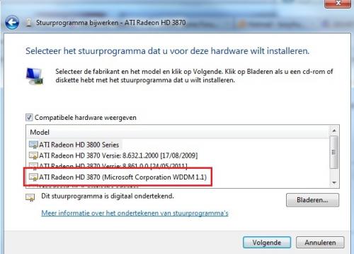Deze nieuwste ATI Radeon drivers, heb je die bij AMD/ATI gedownload? Kun je de standaard Microsoft driver terug zetten? Als je in apparaatbeheer rechtsklikt op je beeldschermadapter en kies Stuurprogramma's bijwerken, vervolgens in het venster wat verschijnt kies je Op mijn computer naar stuurprogramma's zoeken. In het venster wat dan word getoond kies je Dan krijg je uiteindelijk volgend venster Welke staan bij jou hier vermeld?
