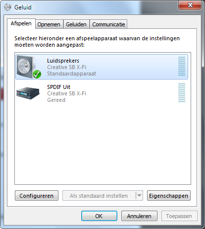 6. Als je rechtsklikt op het luidspreker icoon in de systemtray en kies voor Afspeelapparaten Staat je geluidskaart dan als standaard ingesteld? Op het tabblad Geluiden staat daar onder Geluidsschema > Windows standaard ingesteld?
