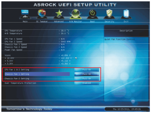 Navigeer in het BIOS eens naar H/W Monitor en kijk eens hoe de rood omlijnde settings bij jou staan? Om in het BIOS te komen druk je herhaaldelijk tijdens het starten van je pc op de Del toets. -