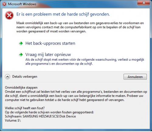 Hallo, Ik heb een ext. Hdd van het merk Medion. het betreft een Externe Hdd type 90132.12 ( 1.5 TB ) Ik gebruik deze hdd via mijn Esata poort, welke een sleuf is uitgespaart in mijn pc. De eerste maanden werkt de schijf prima, maar na verloop begon windows elke nieuwe opstart met scandisk om de schjf te scannen. Dit resulteerde in verloren bestanden en niet te redden data. Ook gaf Windows mij deze foutmelding: Na deze melding kon ik de schijf niet meer gebruiken, totdat ik de pc opnieuw opstart. Ik heb vervolgens een mailcontact gehad met de leverancier ( Medion.nl ) en deze gaf aan de schijf op te sturen voor reparatie ( garantie 2 jaar ) Heb vervolgens de Hdd terug gekregen, maar met de zelfde problemen. Oftewel ik ben nog geen steek verder. Wie zou er mijn kunnen helpen? -