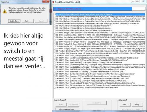 Net voor ik deze laatste 2 dingen wou fixen deed hij het nogmaals. Alle windows gaven "reageert niet meer" en control-alt-delete ging dus ook niet. Dus de lange reeks stappen hierboven hebben dus blijkbaar spijtig genoeg niet geholpen. Ik ga nu deze laatste 2 dingen nog doen en dan laat ik je tegen morgenmiddag weten of hij het sindsdien nog gedaan heeft... Merci Vincent OPMERKING: Tijdens de scan van Hijackthis geeft hij wel op een bepaald punt altijd een melding. Ik kies dan altijd gewoon voor switch to. Soms gaat hij dan gewoon verder en soms geeft hij de melding 100den keren opnieuw en moet ik het programmatje opnieuw laten lopen. Ik weet niet of deze info belangrijk is en of het iets uit maakt maar ik dacht "ik zet het er maar bij je weet nooit" Screen van melding: OPMERKING2: Ik las in een ander topic dit stukje: Dat heb ik ook even bij mij gedaan en ik kreeg bijna 3 pagina's vol met problemen. Ik heb ze allemaal laten herstellen (waren er bijna 300)(met backup) Ik dacht "alle beetjes helpen misschien om het probleem op te lossen" al zal het er misschien niets mee te maken hebben gehad. -