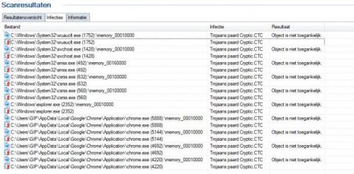 Even een tussentijdse vraag: (of moet dit in nieuw topic??) Ik kreeg net de melding van AVG virusscanner dat ik plotseling met 20 infecties zat. (nog nooit gehad in 1 dag plots zoveel) Nu zegt hij er 10 te hebben verwijderd en 10 die hij niet kon verwijderen... Maar nu zie ik (zie screen) dat die 10 die hij niet kon verwijderen gewoon die andere 10 waren maar dan in memory ofzoiets. Nu is mijn vraag: Is mijn pc veilig? Zijn die andere 10 toch verwijderd of onschadelijk/gevaarlijk en/of hoe krijg ik ze weg indien gevaarlijk? Alvast bedankt. -