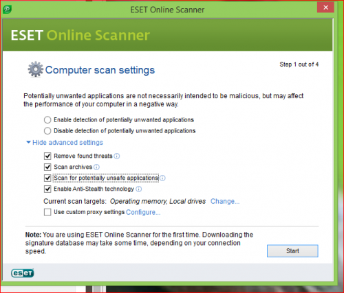 Scan gedaan maar het opvragen van C:\\Program Files\\Eset\\EsetOnlineScanner\\log.txt is niet gelukt , niet bij de 'startknop als bij de bestanden terug te vinden. Misschien is er iets verkeerds gegaan bij het openen van Eset want ik kreeg niet alle optie : Scan for potentially unsafe applications- te zien die je in bericht 10 aangaf. Ik heb wel een afbeelding gemaakt van het eindresultaat na de scan en die gaf aan dat er géén infectie waren. Was het de bedoeling dat ik bovenstaande moest aanklikken? Ik was er niet zeker van en heb dit maar niet gedaan.