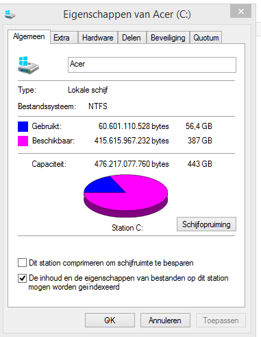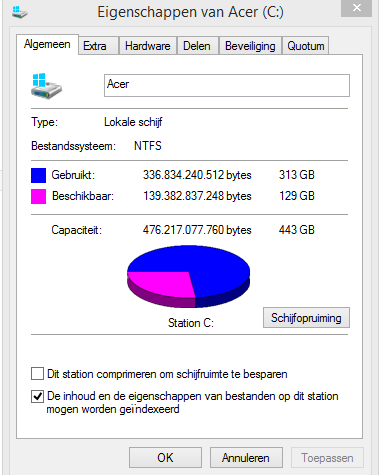 Ik heb een nieuwe laptop aangeschaft en maak gebruik van de standaardprogramma's en bemerkte dat de schijf bijna vol was. Een aantal dingen geprobeerd te verwijderen- zoals een aantal back-ups - maar de schijf heeft toch nog maar weinig ruimte over. Zelf kom ik er niet achter wat nou precies zoveel ruimte in beslag neemt dus graag weer jullie hulp.
