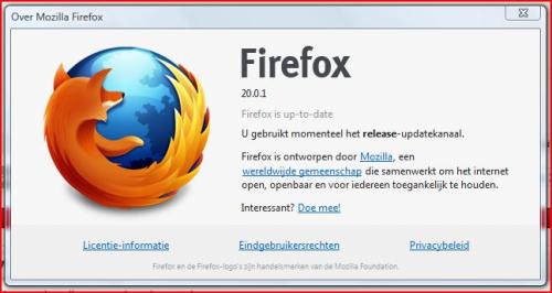 9. Ik zie dat ik firefox twee in mijn bestand staan. Het blijkt dat ik toch al gebruik maak van zelfs versie 20.01 en ik denk dat dit na zoek.exe is gebeurd ik heb toen een melding van Firefox gezien dat deze was geïnstalleerd maar heb er verder geen aandacht aan geschonken. De oudere versie heb ik intussen verwijderd!