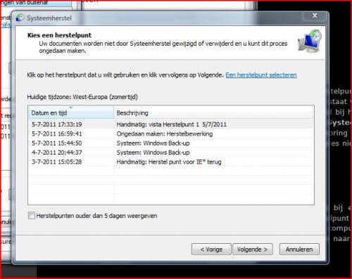 1. Om eerlijk te zijn , begrijp ik het allemaal niet zo maar ik he een systeem herstel gedaan en naar een oudere datum geprobeerd terug te zetten maar.....de datum gaat niet verder terug dan 3/07/2011. En de datum moet verder terug , zover ik kan zien,naar 12/06/20011. Wel nog bedankt voor de duidelijke link!