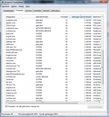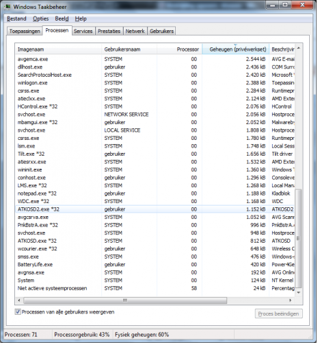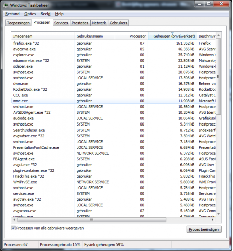 Ik merkte net dat ik, ookal doe ik weinig, 50% of iets meer RAM useage had. Vlag voor ik afsloot en opnieuw opstarte, was dit zelfs 90% terwijl ik alles had uitgedaan. Graag wat hulp. In bijlage zitten wat screenshots van Taak Beheer processen. Hier is een HJT logje. Zijn er dingen die niet kloppen? Logfile of Trend Micro HijackThis v2.0.4 Scan saved at 19:00:25, on 9/01/2012 Platform: Windows 7 SP1 (WinNT 6.00.3505) MSIE: Internet Explorer v9.00 (9.00.8112.16421) Boot mode: Normal Running processes: C:\Program Files (x86)\ASUS\ATK Package\ATKOSD2\ATKOSD2.exe C:\Program Files (x86)\AVG\AVG2012\avgtray.exe C:\Program Files (x86)\Malwarebytes' Anti-Malware\mbamgui.exe C:\Program Files (x86)\Mouse Driver\Tilt.exe C:\Program Files (x86)\RocketDock\RocketDock.exe C:\Program Files (x86)\AVG\AVG2012\avgui.exe C:\Program Files (x86)\Mozilla Firefox\firefox.exe C:\Program Files (x86)\Mozilla Firefox\plugin-container.exe D:\Important\HijackThis.exe R1 - HKCU\Software\Microsoft\Internet Explorer\Main,Default_Page_URL = Asus | MSN R1 - HKCU\Software\Microsoft\Internet Explorer\Main,Search Page = Bing R0 - HKCU\Software\Microsoft\Internet Explorer\Main,Start Page = about:Tabs R1 - HKLM\Software\Microsoft\Internet Explorer\Main,Default_Page_URL = Hotmail, Messenger, nieuws en entertainment vind je op MSN.nl R1 - HKLM\Software\Microsoft\Internet Explorer\Main,Default_Search_URL = Bing R1 - HKLM\Software\Microsoft\Internet Explorer\Main,Search Page = Bing R0 - HKLM\Software\Microsoft\Internet Explorer\Main,Start Page = Hotmail, Messenger, nieuws en entertainment vind je op MSN.nl R0 - HKLM\Software\Microsoft\Internet Explorer\Search,SearchAssistant = R0 - HKLM\Software\Microsoft\Internet Explorer\Search,CustomizeSearch = R0 - HKLM\Software\Microsoft\Internet Explorer\Main,Local Page = C:\Windows\SysWOW64\blank.htm R0 - HKCU\Software\Microsoft\Internet Explorer\Toolbar,LinksFolderName = F2 - REG:system.ini: UserInit=userinit.exe O1 - Hosts: ::1 localhost O2 - BHO: AcroIEHelperStub - {18DF081C-E8AD-4283-A596-FA578C2EBDC3} - C:\Program Files (x86)\Common Files\Adobe\Acrobat\ActiveX\AcroIEHelperShim.dll O2 - BHO: WormRadar.com IESiteBlocker.NavFilter - {3CA2F312-6F6E-4B53-A66E-4E65E497C8C0} - C:\Program Files (x86)\AVG\AVG2012\avgssie.dll O2 - BHO: (no name) - {5C255C8A-E604-49b4-9D64-90988571CECB} - (no file) O2 - BHO: Groove GFS Browser Helper - {72853161-30C5-4D22-B7F9-0BBC1D38A37E} - C:\PROGRA~2\MICROS~1\Office14\GROOVEEX.DLL O2 - BHO: Windows Live Aanmelden - Help - {9030D464-4C02-4ABF-8ECC-5164760863C6} - C:\Program Files (x86)\Common Files\Microsoft Shared\Windows Live\WindowsLiveLogin.dll O2 - BHO: URLRedirectionBHO - {B4F3A835-0E21-4959-BA22-42B3008E02FF} - C:\PROGRA~2\MICROS~1\Office14\URLREDIR.DLL O2 - BHO: Bing Bar Helper - {d2ce3e00-f94a-4740-988e-03dc2f38c34f} - "C:\Program Files (x86)\Microsoft\BingBar\BingExt.dll" (file missing) O2 - BHO: Java Plug-In 2 SSV Helper - {DBC80044-A445-435b-BC74-9C25C1C588A9} - C:\Program Files (x86)\Java\jre6\bin\jp2ssv.dll O3 - Toolbar: Bing Bar - {8dcb7100-df86-4384-8842-8fa844297b3f} - "C:\Program Files (x86)\Microsoft\BingBar\BingExt.dll" (file missing) O4 - HKLM\..\Run: [updateLBPShortCut] "C:\Program Files (x86)\CyberLink\LabelPrint\MUITransfer\MUIStartMenu.exe" "C:\Program Files (x86)\CyberLink\LabelPrint" UpdateWithCreateOnce "Software\CyberLink\LabelPrint\2.5" O4 - HKLM\..\Run: [updateP2GoShortCut] "C:\Program Files (x86)\CyberLink\Power2Go\MUITransfer\MUIStartMenu.exe" "C:\Program Files (x86)\CyberLink\Power2Go" UpdateWithCreateOnce "SOFTWARE\CyberLink\Power2Go\6.0" O4 - HKLM\..\Run: [startCCC] "C:\Program Files (x86)\ATI Technologies\ATI.ACE\Core-Static\CLIStart.exe" MSRun O4 - HKLM\..\Run: [ATKOSD2] C:\Program Files (x86)\ASUS\ATK Package\ATKOSD2\ATKOSD2.exe O4 - HKLM\..\Run: [ATKMEDIA] C:\Program Files (x86)\ASUS\ATK Package\ATK Media\DMedia.exe O4 - HKLM\..\Run: [HControlUser] C:\Program Files (x86)\ASUS\ATK Package\ATK Hotkey\HControlUser.exe O4 - HKLM\..\Run: [AVG_TRAY] "C:\Program Files (x86)\AVG\AVG2012\avgtray.exe" O4 - HKLM\..\Run: [Malwarebytes' Anti-Malware] "C:\Program Files (x86)\Malwarebytes' Anti-Malware\mbamgui.exe" /starttray O4 - HKLM\..\Run: [inno Tilt] "C:\Program Files (x86)\Mouse Driver\Tilt.exe" /hide O4 - HKLM\..\RunOnce: [Malwarebytes Anti-Malware] C:\Program Files (x86)\Malwarebytes' Anti-Malware\mbamgui.exe /install /silent O4 - HKLM\..\RunOnce: [innoSetupRegFile.0000000001] "C:\Windows\is-OOTD9.exe" /REG /REGSVRMODE O4 - HKCU\..\Run: [RocketDock] "C:\Program Files (x86)\RocketDock\RocketDock.exe" O4 - HKCU\..\Run: [sidebar] C:\Program Files\Windows Sidebar\sidebar.exe /autoRun O8 - Extra context menu item: &Verzenden naar OneNote - res://C:\PROGRA~2\MICROS~1\Office14\ONBttnIE.dll/105 O8 - Extra context menu item: E&xporteren naar Microsoft Excel - res://C:\PROGRA~2\MICROS~1\Office14\EXCEL.EXE/3000 O9 - Extra button: In weblog opnemen - {219C3416-8CB2-491a-A3C7-D9FCDDC9D600} - C:\Program Files (x86)\Windows Live\Writer\WriterBrowserExtension.dll O9 - Extra 'Tools' menuitem: &In weblog opnemen met Windows Live Writer - {219C3416-8CB2-491a-A3C7-D9FCDDC9D600} - C:\Program Files (x86)\Windows Live\Writer\WriterBrowserExtension.dll O9 - Extra button: Verzenden naar OneNote - {2670000A-7350-4f3c-8081-5663EE0C6C49} - C:\Program Files (x86)\Microsoft Office\Office14\ONBttnIE.dll O9 - Extra 'Tools' menuitem: &Verzenden naar OneNote - {2670000A-7350-4f3c-8081-5663EE0C6C49} - C:\Program Files (x86)\Microsoft Office\Office14\ONBttnIE.dll O9 - Extra button: &Gekoppelde notities van OneNote - {789FE86F-6FC4-46A1-9849-EDE0DB0C95CA} - C:\Program Files (x86)\Microsoft Office\Office14\ONBttnIELinkedNotes.dll O9 - Extra 'Tools' menuitem: &Gekoppelde notities van OneNote - {789FE86F-6FC4-46A1-9849-EDE0DB0C95CA} - C:\Program Files (x86)\Microsoft Office\Office14\ONBttnIELinkedNotes.dll O11 - Options group: [ACCELERATED_GRAPHICS] Accelerated graphics O18 - Protocol: linkscanner - {F274614C-63F8-47D5-A4D1-FBDDE494F8D1} - C:\Program Files (x86)\AVG