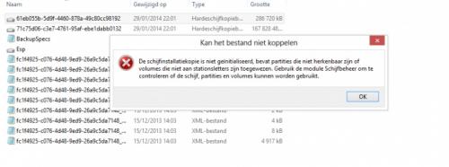 1. Hoi, in december vorig jaar kocht ik een externe harde schijf van 1TB. Via Windows 8 back-up heb ik toen een back-up aangemaakt. Enkele weken later had ik een probleem met mijn pc waardoor ik deze voor herstelling heb binnen gebracht, mijn pc probleem had niets te maken met mijn harde schijf op dat moment. Maar nu hij uit herstelling is gekomen lees ik bij de herstellingsinformatie dat ze een nieuwe harde schijf hebben geplaatst, waardoor ik uiteraard al mijn vorige bestanden kwijt ben. Mijn probleem is nu, wanneer ik probeer om via Windows 8 back up mijn bestanden terug te zetten, dit niet bepaalt lukt. Weet ook niet juist waarom, weet eigenlijk ook niet goed hoe hieraan te beginnen. Heb wel al enkele tips gezocht op het net maar niets helpt. Wanneer ik via mijn externe harde schijf op de verkenner klik en zo de bestanden probeer te openen zie ik dit: Weet iemand hoe ik dit probleem kan oplossen? Of ben ik, zoals ik vrees, mijn back up kwijt en zal ik nooit aan mijn bestanden geraken? Hopelijk weet iemand wat ik verkeerd doe of wat het probleem zou kunnen zijn. Alvast bedankt voor ieders moeite. Ik ben jullie nu al heel dankbaar.