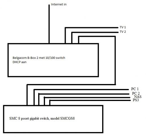 Router is de B-Box 2 van Belgacom... Heeft maar 10/100 netwerk; Vandaar dat ik 1 poort van de B-Box 2 met men switch verbonden heb en daarna alles van PC's aan de switch zodoende deze gegevens kunnen uitwisselen aan gigabit ipv de 10/100 netwerk aansluiting van de B-Box 2 Bedankt alvast voor de hulp! Mvg, Fré