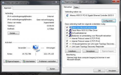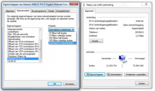Bij status van de LAN verbinding staat toch bij Snelheid: 1,0 Gbps? En mijn (= laptop) netwerkkaart is Atheros AR8131 PCI-E Gigabit Ethernet Controller... Andere PC (desktop) heeft een Gigabit netwerkkaart die ik bij Forcom gekocht heb begin dit jaar. Laatste bijlage is een screenshot van over 2 maand, toen met extreem lage snelheid. Mvg, Fré -