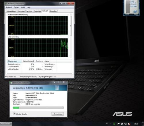 Bij status van de LAN verbinding staat toch bij Snelheid: 1,0 Gbps? En mijn (= laptop) netwerkkaart is Atheros AR8131 PCI-E Gigabit Ethernet Controller... Andere PC (desktop) heeft een Gigabit netwerkkaart die ik bij Forcom gekocht heb begin dit jaar. Laatste bijlage is een screenshot van over 2 maand, toen met extreem lage snelheid. Mvg, Fré -