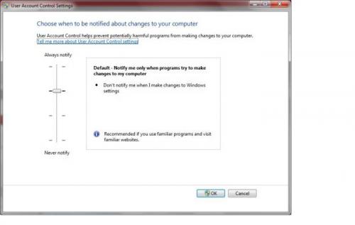 4. UAC staat voor "User Account Control" en is een veiligheidsoptie die u terugvind bij Beheer - Gebruikers. U kiest de onderste optie voor uw account : en u zet de setting op standaard, tweede hoogste level. Het resultaat is dat u verwittigd wordt wanneer een programma veranderingen aan uw systeem wil maken, u kunt dan wel gewoon confirmeren. Misschien geeft dit ons een spoor wat er gaande is. Normaal zou u de verwittiging niet mogen krijgen, bij routine gebruik van de PC. Gebeurt het toch kunt u dan even doorgeven met welk programma ?