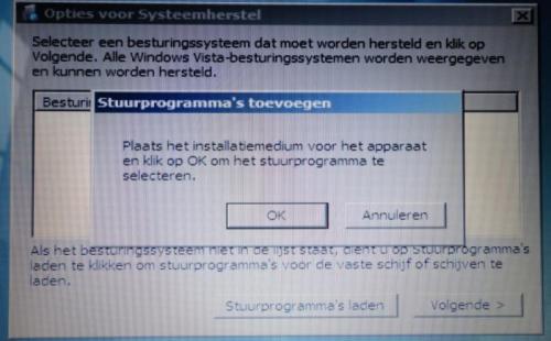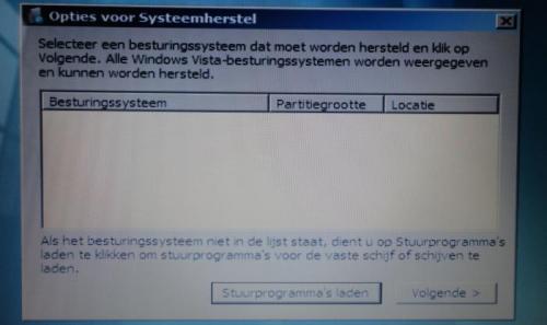 Beste, Mijn PC vertoonde bij het opstarten altijd de Blue Screens of Death. Na wat rondneuzen heb ik deze opgestart met de Vista CD. Op een moment moet je een besturingssysteem selecteren dat moet worden hersteld. Alle systemen worden normaal weergegeven. Bij mij verschijnt hier echter niets in de lijst. Ik kan 'Stuurprogramma's laden' kiezen en dan verschijnt dat ik een installatiemedium moet plaatsen. Welk medium? Moet ik gewoon mijn C schijf kiezen, de CD rom, of iets anders? Heel erg bedankt! ---------- Post toegevoegd om 19:35 ---------- Vorige post was om 19:25 ---------- C schijf zal het niet zijn zeker, want de PC verwacht blijkbaar Setup-gegevens (bij bestandstypen). Iemand een idee aub?