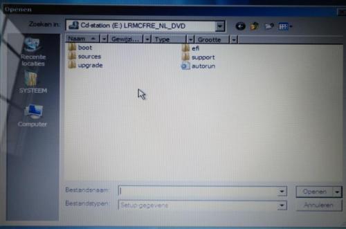 Het Windows vlagje verschijnt inderdaad bij het opstarten. Ik zit nu in deze fase: Heb opgestart vanop CD rom Vista Heb taal en tijd gekozen En krijg nu dit, een lege lijst: Ik klik dus op Stuurprogramm&'s laden en krijg dit: Ik klik op OK en hij vraagt een Setup gegeven om te seleceteren. Dus ik dacht dat ik de CD rom van Vista moest openen, maar daar krijg ik dit: Ik weet dus niet wat te doen. Bedankt! -