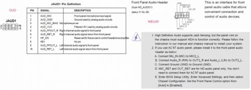 4. Beste mensen, Ik heb recent een defect moederbord vervangen door een nieuw moederbord. Dat ging prima behalve de FPaud connector. De computer is een FUJITSU/SIEMENS SCALEO PI 2510 met een MICROSTAR MODEL MS 7293 moederbord Het moederbord en de kast beschikken over een AC97 aansluiting voor het audio front panel. Ik heb de FP audio connector van het oude moederbord verwijderd en vraag me nu af of ik die aansluiting van het audio front panel van de kast zonder problemen in de PFaud connector van het nieuwe moederbord kan steken. Het nieuwe moederbord is een ASrock G41C-GS moederbord dat in het BIOS omschakelbaar is tussen HD audio en AC97 audio. Ik heb de informatie uit de handleiding van de beide moederborden gecombineerd in een jpg bestand: Links staat de info over de aansluiting op het oude moederbord waar de front panel audio connector op aangesloten was. Rechts staat de info over de aansluiting op het nieuwe moederbord waar ik de front panel audio connector nu op aan wil sluiten. Heeft iemand daar ervaring mee? Ik denk dat het wel gaat maar vrees toch een mogelijk defect en ik overweeg een aantal niet noodzakelijke aansluitingen los te knippen maar zou dat liever niet doen. Vriendelijk bedankt voor het lezen. Met vriendelijke groeten, Fred.