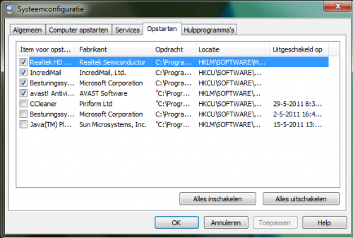 Bedankt voor je hulp ik heb die O-15 verwijdert. Maar ik zie GEEN verbetering:thumpdown:. Mijn PC blijft maar vast lopen, het geheugen staat op 37% als ik niks doe ik hoef alleen een programma te starten en loopt weer vast en gaat weer tussen de 80% en 90% staan. Om eerlijk te zijn vind ik dit héél zonder, de PC is nog niet eens 5 maanden oud en is weer toe aan een herinstallatie. Ik zou niet weten hoe ik de PC gewoon laat lopen zonder het te herinstalleren. (Syteem herstel helpt niet dan zet ik hem terug in dezelfde staat) Dit is de status van de beveiliging van mijn PC (hiermee kun je zien of mijn PC veilig is): Antivirus: Avast! (up-to-date mag automatich bijwerken) Firewall: aan Automatiche updates: aan Windows Sercurity Center: uit => kan niet worden gestart. (heb het geprobeerd) Windows Defender: doet het niet. (waarom weet ik niet) Ik weet het echt niet meer! Ik weet niet wat ik kan doen. !!!HELP ME!!! -