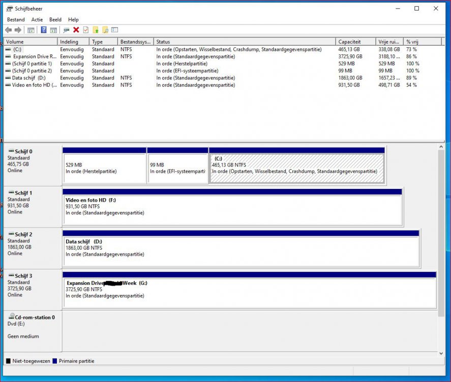 Een verkeerde interpretatie is mogelijk, ik zie de afbeelding/bijlage met de schijven als ik, naar links onder "start" ga dan zie in in windows verkenner de externe seagate HD expansion drive G: heet die blijkbaar, als ik daar op dubbel klik ziek in rechtse kolom ******X-desktop-1.tibx, dubbelklik ik daarop zie ik in de rechtse kolom "back-up vr, apr 16 21 22:50:13 ******-desktop-1" dubbelklik ik daar op dan zie ik de partities en schijven zoals in bijlage. maar als uw verklaring klopt zou één van de niet getoonde schijven in fat 32 geformatteerd zijn terwijl dat blijkt uit de tweede bijlage dat deze toch echt in NTFS geformatteerd werd of sla ik de bal volledig mis? Als ik dubbel klik op de D en F schijf (u hebt het dan over partities) klik krijg ik de inhoud te zien van wat er op die schijven staat en dat is voor de D allemaal data en de F al mijn foto's en films dus ik denk toch dat die D en F naar schijven in mijn PC verwijzen en niet naar partities van de C schijf Noot: De X-en in de beschrijving staan in de plaats voor mijn naam. thx catmen