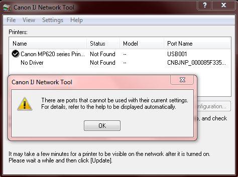 Ik heb de printer het vaste ip adres gegeven, met als resultaat dat de Canon IJ Network Tool deze nu wel vindt. Maar hij werkt nog niet, geeft aan 'No Driver'. Zie de foutmelding: -