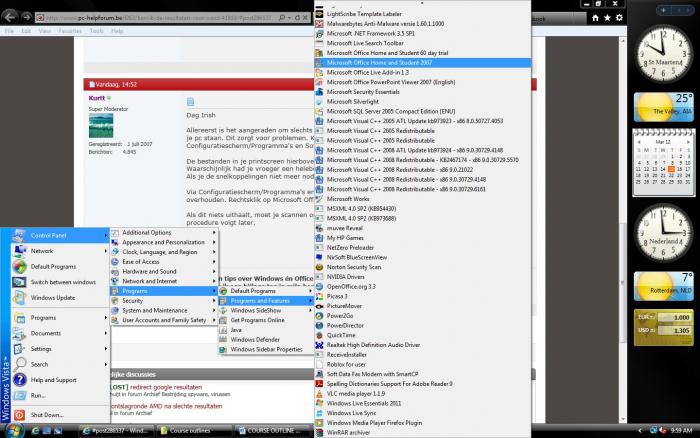Ik weet niet precies wanneer de pc en de Office versie gekocht zijn, maar dat is al zeker 3 jaar geleden. Ik heb de trial versie verwijderd, want ik gebruik toch altijd de 2007 versie. En voor de zekerheid ook maar een highjackthis logje gemaakt: C:\Windows\system32\wuauclt.exe C:\Program Files\Internet Explorer\iexplore.exe C:\Program Files\Internet Explorer\iexplore.exe C:\Program Files\Microsoft Office\Office12\WINWORD.EXE C:\Program Files\Microsoft\Office Live\OfficeLiveSignIn.exe C:\Program Files\Internet Explorer\iexplore.exe C:\Users\user\Desktop\HijackThis.exe R1 - HKCU\Software\Microsoft\Internet Explorer\Main,Default_Page_URL = AOL.com - News, Sports, Weather, Entertainment, Stocks & Local R1 - HKCU\Software\Microsoft\Internet Explorer\Main,Search Page = Bing R0 - HKCU\Software\Microsoft\Internet Explorer\Main,Start Page = Google R1 - HKLM\Software\Microsoft\Internet Explorer\Main,Default_Page_URL = AOL.com - News, Sports, Weather, Entertainment, Stocks & Local R1 - HKLM\Software\Microsoft\Internet Explorer\Main,Default_Search_URL = Bing R1 - HKLM\Software\Microsoft\Internet Explorer\Main,Search Page = Bing R0 - HKLM\Software\Microsoft\Internet Explorer\Main,Start Page = AOL.com - News, Sports, Weather, Entertainment, Stocks & Local R0 - HKLM\Software\Microsoft\Internet Explorer\Search,SearchAssistant = R0 - HKLM\Software\Microsoft\Internet Explorer\Search,CustomizeSearch = R0 - HKCU\Software\Microsoft\Internet Explorer\Toolbar,LinksFolderName = R3 - URLSearchHook: (no name) - {88c7f2aa-f93f-432c-8f0e-b7d85967a527} - (no file) O1 - Hosts: ::1 localhost O2 - BHO: AcroIEHelperStub - {18DF081C-E8AD-4283-A596-FA578C2EBDC3} - C:\Program Files\Common Files\Adobe\Acrobat\ActiveX\AcroIEHelperShim.dll O2 - BHO: Search Helper - {6EBF7485-159F-4bff-A14F-B9E3AAC4465B} - C:\Program Files\Microsoft\Search Enhancement Pack\Search Helper\SEPsearchhelperie.dll O2 - BHO: Windows Live ID Sign-in Helper - {9030D464-4C02-4ABF-8ECC-5164760863C6} - C:\Program Files\Common Files\Microsoft Shared\Windows Live\WindowsLiveLogin.dll O2 - BHO: Google Toolbar Helper - {AA58ED58-01DD-4d91-8333-CF10577473F7} - C:\Program Files\Google\Google Toolbar\GoogleToolbar_32.dll O2 - BHO: Microsoft Live Search Toolbar Helper - {d2ce3e00-f94a-4740-988e-03dc2f38c34f} - c:\Program Files\MSN\Toolbar\3.0.0541.0\msneshellx.dll (file missing) O2 - BHO: Java Plug-In 2 SSV Helper - {DBC80044-A445-435b-BC74-9C25C1C588A9} - C:\Program Files\Java\jre6\bin\jp2ssv.dll O3 - Toolbar: Microsoft Live Search Toolbar - {1E61ED7C-7CB8-49d6-B9E9-AB4C880C8414} - c:\Program Files\MSN\Toolbar\3.0.0541.0\msneshellx.dll (file missing) O3 - Toolbar: Google Toolbar - {2318C2B1-4965-11d4-9B18-009027A5CD4F} - C:\Program Files\Google\Google Toolbar\GoogleToolbar_32.dll O4 - HKLM\..\Run: [Windows Defender] %ProgramFiles%\Windows Defender\MSASCui.exe -hide O4 - HKLM\..\Run: [hpsysdrv] c:\hp\support\hpsysdrv.exe O4 - HKLM\..\Run: [NvCplDaemon] RUNDLL32.EXE C:\Windows\system32\NvCpl.dll,NvStartup O4 - HKLM\..\Run: [HP Health Check Scheduler] c:\Program Files\Hewlett-Packard\HP Health Check\HPHC_Scheduler.exe O4 - HKLM\..\Run: [updateP2GoShortCut] "c:\Program Files\CyberLink\Power2Go\MUITransfer\MUIStartMenu.exe" "c:\Program Files\CyberLink\Power2Go" UpdateWithCreateOnce "SOFTWARE\CyberLink\Power2Go\6.0" O4 - HKLM\..\Run: [updatePDIRShortCut] "c:\Program Files\CyberLink\PowerDirector\MUITransfer\MUIStartMenu.exe" "c:\Program Files\CyberLink\PowerDirector" UpdateWithCreateOnce "SOFTWARE\CyberLink\PowerDirector\7.0" O4 - HKLM\..\Run: [updatePSTShortCut] "c:\Program Files\CyberLink\CyberLink DVD Suite Deluxe\MUITransfer\MUIStartMenu.exe" "c:\Program Files\CyberLink\CyberLink DVD Suite Deluxe" UpdateWithCreateOnce "Software\CyberLink\PowerStarter" O4 - HKLM\..\Run: [HP Software Update] C:\Program Files\HP\HP Software Update\HPWuSchd2.exe O4 - HKLM\..\Run: [MSC] "c:\Program Files\Microsoft Security Client\msseces.exe" -hide -runkey O4 - HKLM\..\Run: [Adobe Reader Speed Launcher] "C:\Program Files\Adobe\Reader 9.0\Reader\Reader_sl.exe" O4 - HKLM\..\Run: [Adobe ARM] "C:\Program Files\Common Files\Adobe\ARM\1.0\AdobeARM.exe" O4 - HKLM\..\RunOnce: [Malwarebytes Anti-Malware] C:\Program Files\Malwarebytes' Anti-Malware\mbamgui.exe /install /silent O4 - HKCU\..\Run: [sidebar] C:\Program Files\Windows Sidebar\sidebar.exe /autoRun O4 - HKCU\..\Run: [ehTray.exe] C:\Windows\ehome\ehTray.exe O4 - HKCU\..\Run: [swg] "C:\Program Files\Google\GoogleToolbarNotifier\GoogleToolbarNotifier.exe" O4 - HKCU\..\Run: [WMPNSCFG] C:\Program Files\Windows Media Player\WMPNSCFG.exe O4 - Startup: Dropbox.lnk = C:\Users\user\AppData\Roaming\Dropbox\bin\Dropbox.exe O8 - Extra context menu item: Add to Google Photos Screensa&ver - res://C:\Windows\system32\GPhotos.scr/200 O8 - Extra context menu item: E&xport to Microsoft Excel - res://C:\PROGRA~1\MICROS~4\Office12\EXCEL.EXE/3000 O8 - Extra context menu item: Search the Web - C:\Program Files\SweetIM\Toolbars\Internet Explorer\resources\menuext.html O9 - Extra button: @C:\Program Files\Windows Live\Writer\WindowsLiveWriterShortcuts.dll,-1004 - {219C3416-8CB2-491a-A3C7-D9FCDDC9D600} - C:\Program Files\Windows Live\Writer\WriterBrowserExtension.dll O9 - Extra 'Tools' menuitem: @C:\Program Files\Windows Live\Writer\WindowsLiveWriterShortcuts.dll,-1003 - {219C3416-8CB2-491a-A3C7-D9FCDDC9D600} - C:\Program Files\Windows Live\Writer\WriterBrowserExtension.dll O9 - Extra button: Send to OneNote - {2670000A-7350-4f3c-8081-5663EE0C6C49} - C:\PROGRA~1\MICROS~4\Office12\ONBttnIE.dll O9 - Extra 'Tools' menuitem: S&end to OneNote - {2670000A-7350-4f3c-8081-5663EE0C6C49} - C:\PROGRA~1\MICROS~4\Office12\ONBttnIE.dll O9 - Extra button: Research - {92780B25-18CC-41C8-B9BE-3C9C571A8263} - C:\PROGRA~1\MICROS~4\Office12\REFIEBAR.DLL O11 - Options group: [ACCELERATED_GRAPHICS] Accelerated graphics O16 - DPF: {3D3B42C2-11BF-4732-A304-A01384B70D68} (UploadListView Class) - http://picasaweb.google.com/s/v/68.16/uploader2.cab O16 - DPF: {B516CA4E-A5BA-405C-AFCF-A97