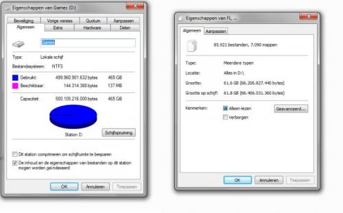 Hallo, Mijn D: schijf van 500 Gb is inmiddels bijna vol, maar het totale formaat van de bestanden is pas 61 gb. Hieronder een print-screen van de situatie: De linkerafbeelding is de eigenschappen van de D: schijf zelf Rechts zijn de eigenschappen van alle bestanden op de schijf. (ctrl+a, eigenschappen) Weet iemand hoe het kan dat deze schijf van de 1 op de andere dag gevuld wordt? En dat de totale bestandsgrootte niet eens 500 Gb is?? Vriendelijke groet, Jan Willem