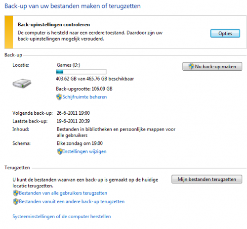 Nee.. op dit moment is er nog niks aan de hand, dat weet ik Ik heb het bestand vorige week verwijderd, dus kwam er opeens weer 400Gb beschikbaar. Volgens de uitleg van kweezie wabbit zal zondag, na de geplande back-up, weer hetzelfde bestand in de D schijf staan. Tot die tijd ziet alles er normaal uit als het goed is. Zondag of Maandag zal ik rapporteren wat er dan gebeurd is.