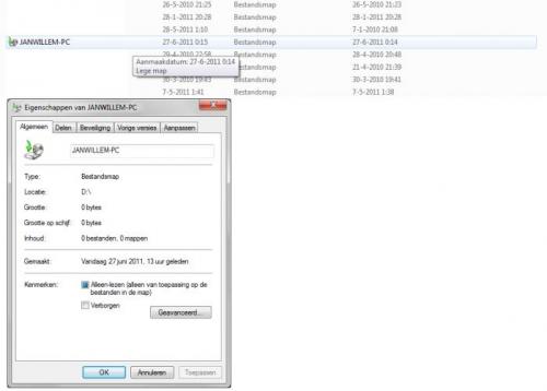 O dit moment is ie nog niet teruggekomen, dus ik wacht nog heel even. Hij heeft in ieder geval dezelfde naam als mijn computer in ons netwerk heet. JANWILLEM-PC dus... verder kan ik nog niet veel zeggen, behalve dat als ik in eigenschappen kijk bij dit bestand, dat het dan een bestandsmap genoemd wordt, terwijl het icoon lijkt op een back-up bestand.