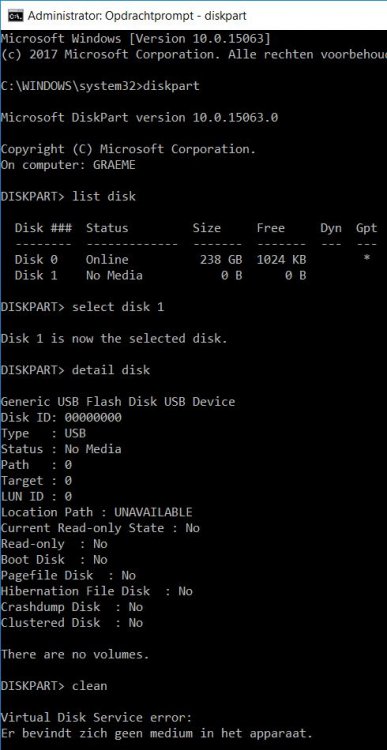 Dag, Ik heb een USB-stick gekregen van iemand die ik ken om data terug te halen. Ze heeft per ongeluk de bestanden gewist en de USB-stick geformatteerd (ze wist niet wat dit betekende). Echter als ik de USB-stick in mijn laptop steek, krijg ik enkele vreemde fouten: als ik de drive wil openen krijg ik volgende fout: (afbeelding 01) wil ik deze opnieuw formatteren (rechts > formatteren...): (afbeelding 02) in computerbeheer > schijfbeheer staan geen partities en geen staat er geen media: (afbeelding 03) in diskpart krijg ik de melding dat de USB-stick 0 bytes groot is: (afbeelding 04) de USB krijgt ook vee rapper warm dan andere USB's. Ik heb al geprobeerd drivers te updaten, drivers verwijderen en opnieuw installeren, een registerkey aanpassen, enkele programmatjes die dit zouden moeten kunnen oplossen maar geen enkel vindt de stick (terwijl windows verkenner wel). Iemand ideetjes? Alvast bedankt!- 5 antwoorden
