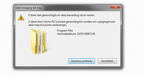 Ik heb de volledige handleiding gevolgd en het zowel naar administrators als naar mijn account het volledig beheer gebracht maar nu komt er nog steeds dezelfde foutmelding alleen met een andere naam i.p.v. trustedinstaller (nu is het de naam die de beveiliging in handen heeft)