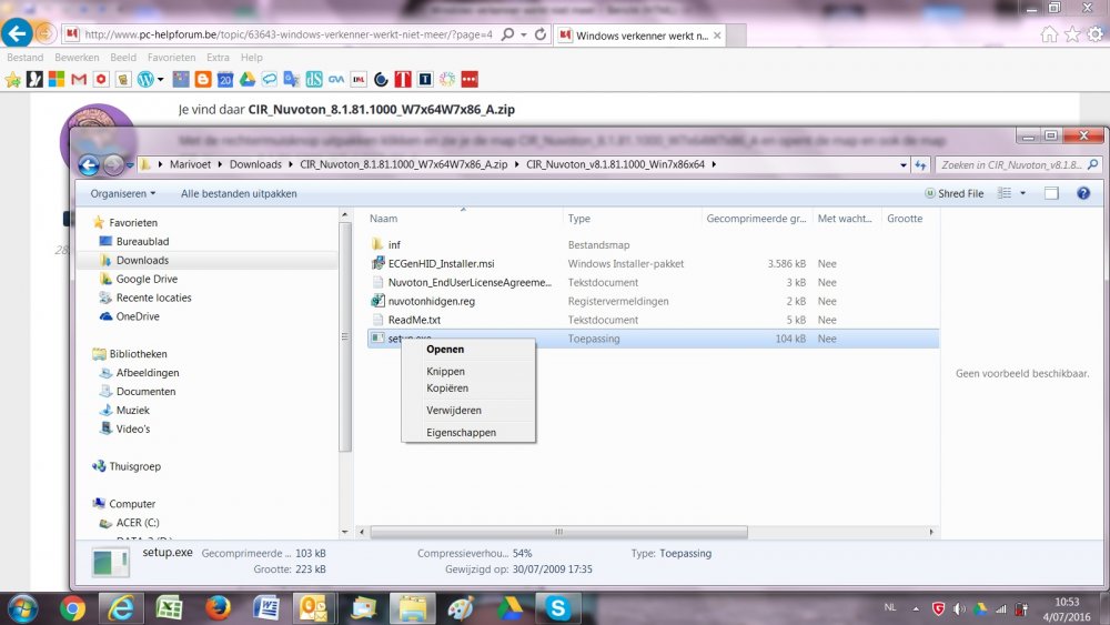 Even nog vermelden dat wanneer ik op uitpakken klik op CIR_Nuvoton_8.1.81.1000_W7x64W7x86_A.zip, sluit Windows verkenner zich af.