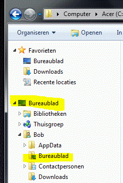 3. Heb pas Windows 7 geïnstalleerd en ben wat aan het lezen in boeken en toepassingen te vergelijken met vroeger. In Widows Verkenner vind ik een gekke mapstructuur terug. Normaal moet je in het navigatiescherm (links) de opslagstructuur zien, met 5 hoofdgroepen: Favorieten, Bibliotheken, Thuisgroep, Computer en Netwerk. Wel, bij mij is dit anders. Ik heb wel bovenaan de Favorieten staan, maar dan staat de rest onder Bureaublad. Normaal vind je het bureaublad onder de gebruiker, in dit geval Bob. Het staat daar ook. Wat is er dan aan de hand? Alles schijnt normaal te werken, maar is toch raar. Ik stuur een knipsel mee van deze structuur. Heeft iemand een idee hoe ik dat kan herstellen?