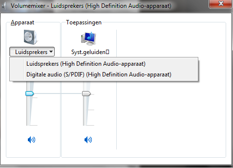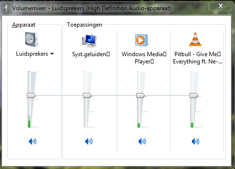 geen geluid via internet, wel via bvb vlcdoedelzak123 reageerde op doedelzak123's topic in Archief Windows Algemeen Hallo, tablad communicatie staat al op 80%, in de volumemixer verschijnt google chrome zelfs niet wanneer ik youtube open. Dus hieronder het voorbeeld. Op het tijdstip dat ik de screenshot nam stond youtube een filmpje te spelen (een liedje). Het viel me tevens op dat wanneer ik op het pijltje klik bij luidspreker er nog iets van digitale audio kwam, en ik weet niet vanwaar die komt. Als ik nu Windows Media Player of VLC open, komt die er wel op.