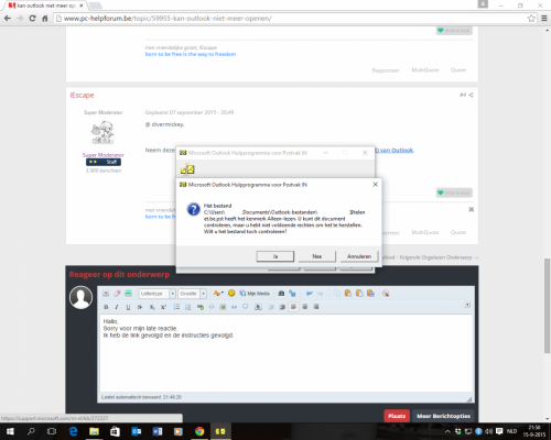 Hallo, Heb sinds twee dagen het probleem dat ik outlook niet meer kan openen. Word, exel ..... enz heeft geen problemen alleen outlook heeft dit. als ik outlook opstart krijg ik volgende melding : Zie printscreen . Hoop dat jullie mij weer kunnen helpen. Alvast bedankt.