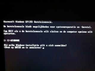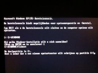 Hoi, Ik heb de recovery console opgestart, en toen kreeg ik het volgende schermpje: daarna heb ik 1 gedrukt voor c:\ windows en toen fixboot enter, en kreeg het volgende schermpje Moet ik nu op ja drukken? of wat moet ik hier doen? ik hoop dat het te lezen is, er staat weet u zeker dat u een nieuwe opstartsector wilt schrijven op partitie c? Ik heb inmiddels j ingetoetst en enter gedrukt. en toen fixmbr enter, en nu krijg ik een waarschuwing namelijk: het lijkt erop dat deze computer een niet-standaard of ongeldige MBR heeft. FIXMBR kan de partitietabellen beshadigen als u doorgaat. hierdoor kunnen alle partities van de active vaste schijf ontoegankelijk worden. ga niet door als u geen problemen hebt met het verkrijgen van toegang tot het station. weet u zeker dat u een nieuwe MBR wilt schrijven? Ik heb inmiddels op j gedrukt, en daarna exit. Hij is afgesloten en is toen weer opgestart, maar weer bleef hij hangen bij het windows logo... Dus hij is weer niet normaal opgestart..