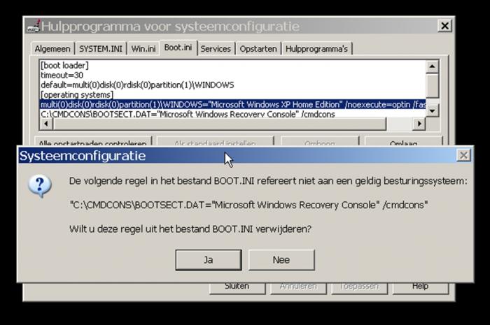 Ik heb via Start>Uitvoeren>Msconfig alle configuraties uitgeprobeerd, zonder succes. Ik maak me wel zorgten om de juistheid van Boot.ini (zie bijlage) ; indien het path getest wordt treedt een fout op! En kan me misschien iemand in 't kort de samenhang en de sekwentie van de bootup procedure beschrijven; samenhang van Bios,Boot.ini, e.a. Met dank Imker -