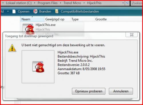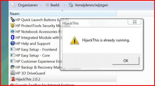 Bedankt voor je snelle reactie. Ik heb HJT op de Vista-wijze gedaan = uitvoeren als adm. dat ik dankzij een andere topic hebben kunnen doen. Want via de snelkoppeling lukte mij dit niet. Nu ga ik de computer scannen met MBAM