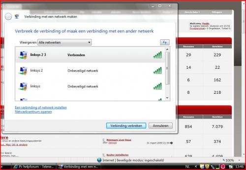Toen ik daarstraks het netwerk controleerde stond er bij beveiligingstype:onbeveiligd. Normaal is dit WPA2-PSK. Bij Windows defender stond er een schildje met uitroepteken. (printscreen 1) Ik klik dat aan en ik moest een scan maken op spyware ed. Dat doe ik dus en alles is in orde. Maar bij beveiligingstype bleef het onbeveiligd. Ik verbreek de verbinding, stel hem weer in maar idemdito. Dan een andere gekozen waar beveiligd bij stond een nieuwe verbinding gemaakt en nog steeds onbeveiligd. Nu heb ik er nog eentje bijgekregen met de naam Linksys2 3. (zie printscreen 2). Ondertussen heb ik er zo'n 4 staan en ik wil er twee wegdoen maar dat lukt me niet. Na een tijdje surfen is de beveiliging (spontaan?) dat toch in orde gekomen. Hoe kan ik zo'n 2 netwerkverbindingen deleten.