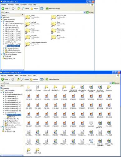 Dank, maar het mocht niet baten. Dus andere ingevingen nog steeds welkom. heb gedaan zoals je aangaf. uitgepakt en reg bestand uitgevoerd. is een heel klein bestandje. had het opgeslagen op mijn bureaublad. kreeg de melding c:\documents and settings\cedric\bureaublad\xp_directory_reg aan het register toevoegen? JA externe hdd en usb blijven enkel snelkoppelingen weergeven. als de virusscan er door gaat zie je mooi alle originele mappen. mapopties staan toch aangevinkt met verborgen mappen tonen. Heb externe hdd en usb ook nog eens met mawarebytes + avg laten doorsnuffelen. Niets gevonden. Kreeg ook 2 x gelijkaardige meldingballon aan de taakbalk. Windows uitgestelde schrijfbewerkingen zijn mislukt